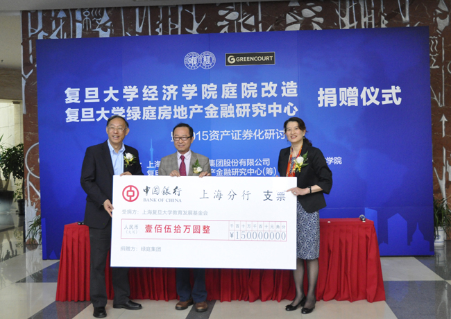 On the afternoon of April 29, 2015, a ceremony was held on the first floor of the school for Greencourt Real Estate Group’s donation to Fudan School of Economics. Ms. Yu Naifen, Chairman of Greencourt (Hong Kong) Co. Ltd. and Greencourt Properties Co. Ltd., is our alumna who graduated from the Department of World Economy in 1987. After Dean Zhang Jun expressed thanks to Greencourt for the donation, Ms. Yu made a short speech speaking of her gratitude to Fudan and the fond memories of her college life. Prof. Feng Xiaoyuan, Vice President of Fudan University, also attended the ceremony and signed the donation agreement with Ms. Yu. The donated funds will be used for the landscaping of the school’s courtyard and the establishment of Fudan-Greencourt Research Center for Real Estate Finance.