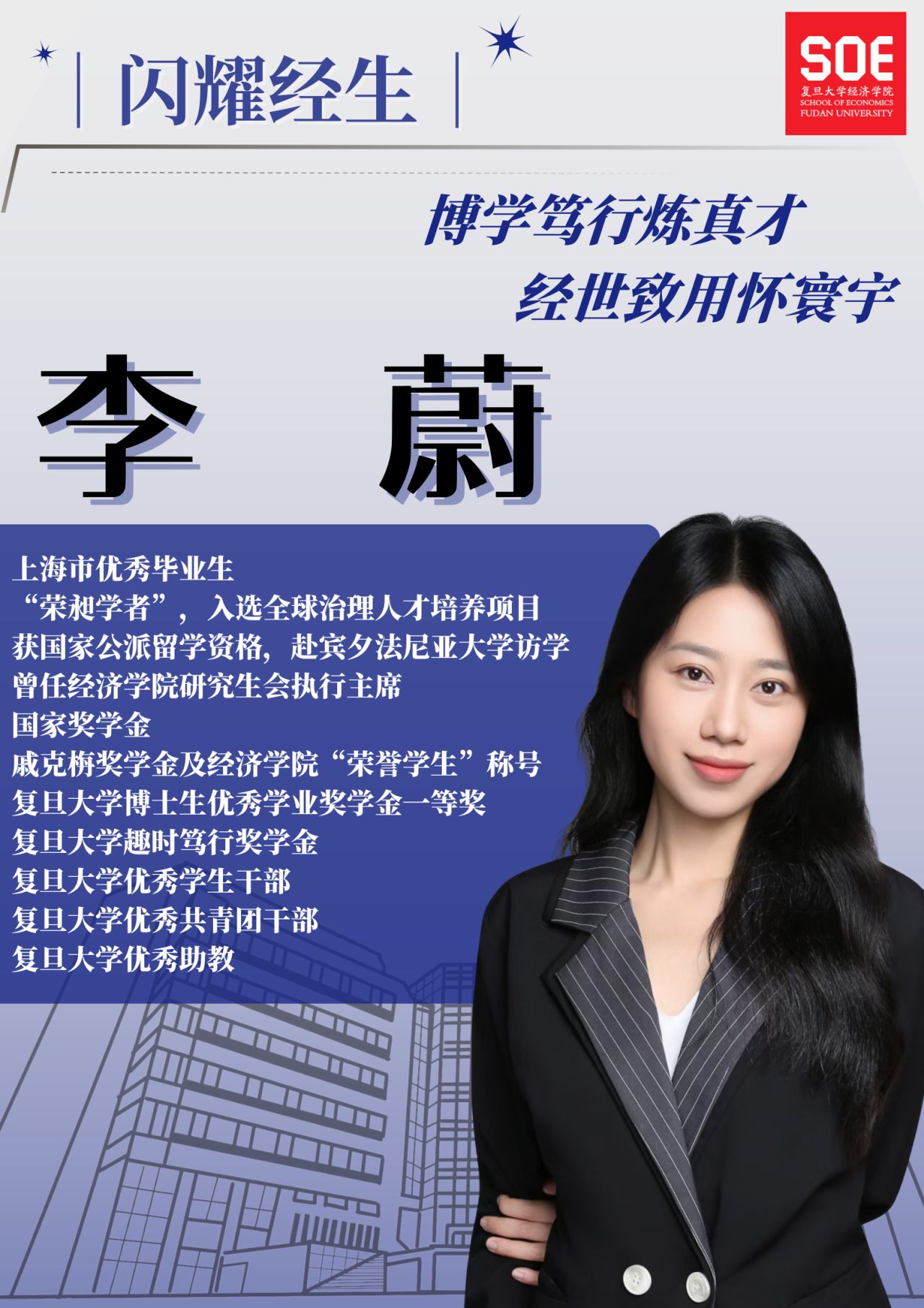 2015级本科生、2019级政治经济学专业硕博连读生。十年经院路,她步步拓展成长维度。不仅学业成绩优异,学术上亦持续深耕,研究聚焦中国特色经济实践,并拓展国际视野,赴宾夕法尼亚大学访学交流。她曾任研究生会主席、班级班长;入选“荣昶学者”,参与国际劳工组织全球治理训练营;也活跃于各类舞台,展现卓越表达力。获上海市优秀毕业生、国家奖学金、博士学业奖学金一等奖、复旦优秀学生干部、六合彩心水