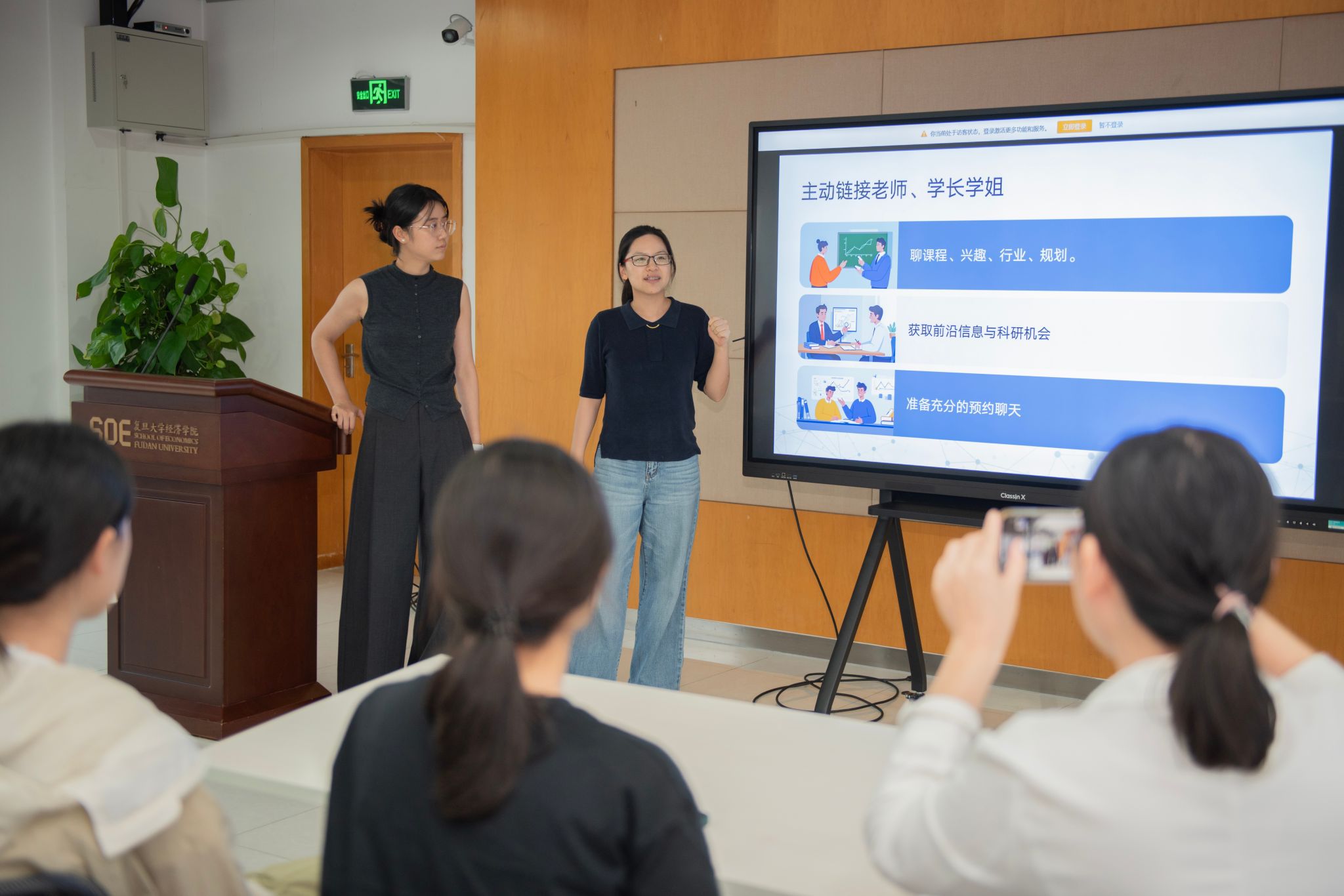 来自2022-2024级数理经济班的6位学长学姐结合各自的亲身经历,从“选课经验”到“个人活动探索”,从“经济学研究是什么”到“实用的研究工具分享”,从“权衡学业和多元能力提升”到“未来个人发展路径的抉择与规划”,主题虽侧重不同,但都全面深入,现身说法、细致周全,精准地抓住了大一新生们的困惑和需求。