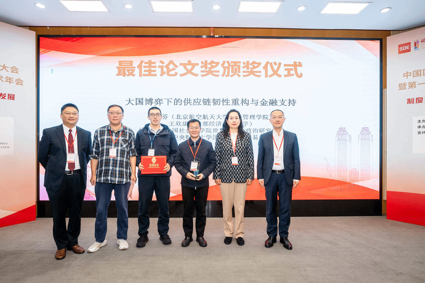 北京航空航天大学的谭小芬及其合作者王欣康(首都经济贸易大学)、吴立元(中国社会科学院)、段玉婉(中央财经大学)共同完成的论文《大国博弈下的供应链韧性重构与金融支持》获得本届年会最佳论文奖。广东金融学院金融与投资学院院长项后军、辽宁大学中国金融研究院副院长杨丽、中国银行上海市分行长三角金融研究院院长张兴荣共同为获奖者颁奖。