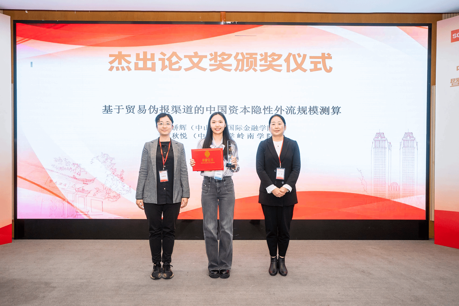 中国人民大学的芦东、俄美合、谢宏杰合作的论文“A Shield for Safety: How China’s Bilateral Currency Swap Agreements Affect Offshore RMB Borrowing Costs”获得本届年会杰出论文奖。昆明学院校长丁文丽、《国际金融研究》副主编赵雪共同为获奖者颁奖。
