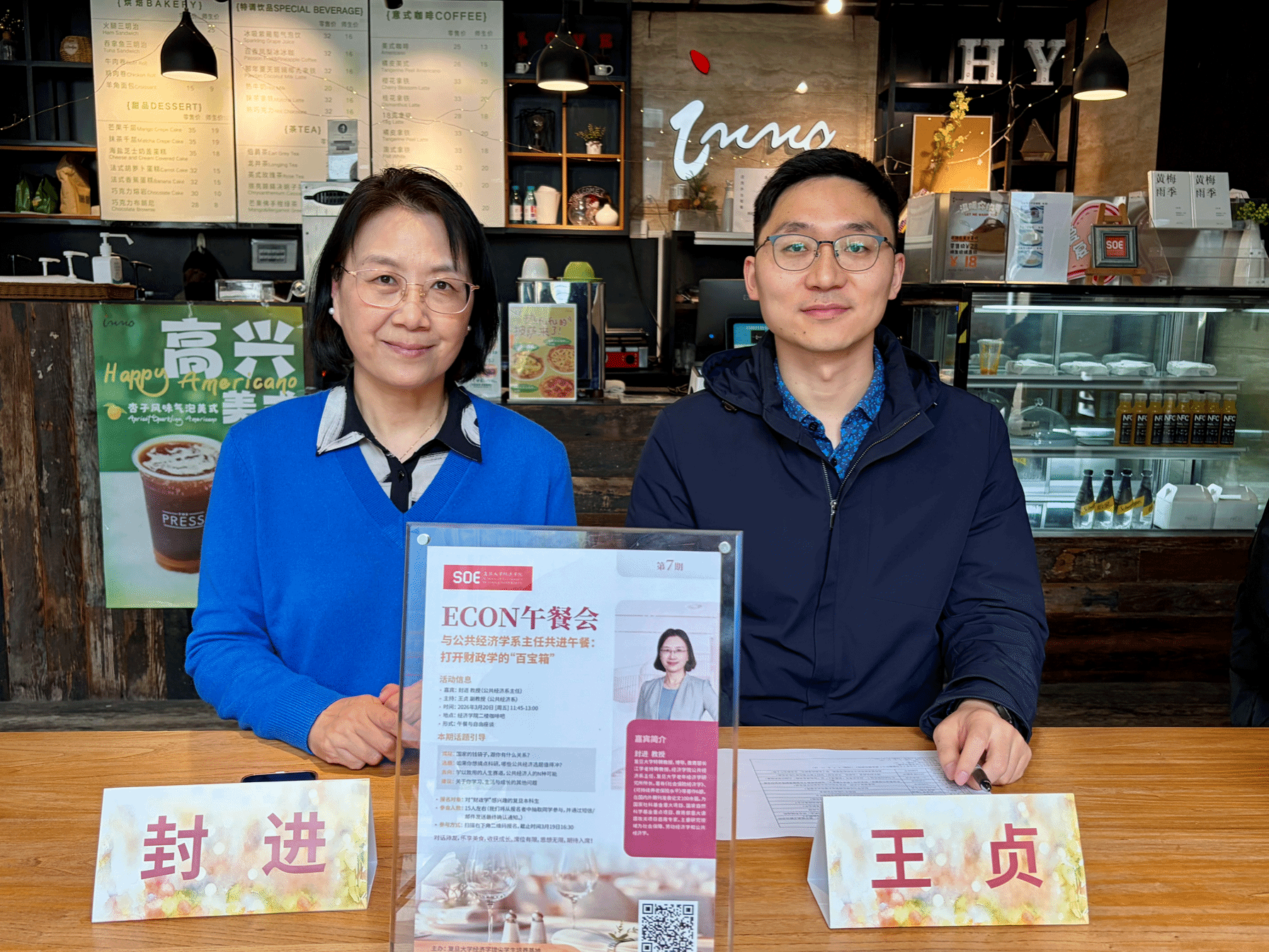 第七期“ECON午餐会”在学院二楼咖啡吧如期举行。本期活动特别邀请了公共经济系系主任封进教授担任主讲嘉宾,并由王贞副教授主持,与学院各年级学子围坐一堂。在轻松的午餐氛围中,师生们围绕财政学的前沿视阈、科研入门路径以及低年级职业规划等话题展开了细致深入的交流。活动旨在通过面对面的沟通,帮助同学们打破对学科的刻板印象,在真实社会治理逻辑中找到学习的动力。