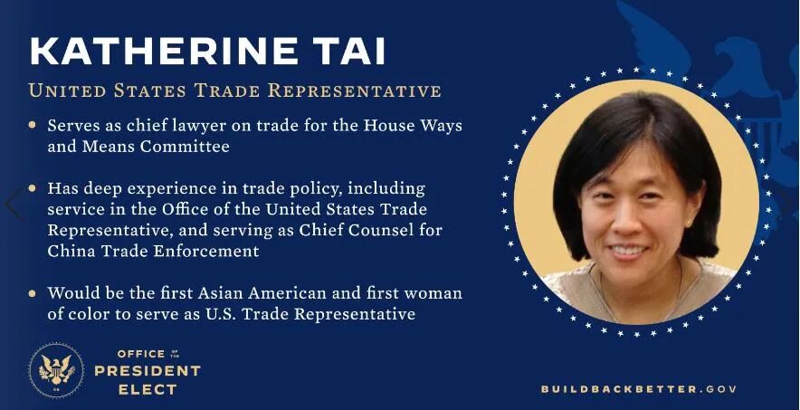 在考察美中贸易风险之前,我们先通过拜登的内阁任命来评析他在对华贸易政策上的总体态度。可以确信的是,拜登至少在反思特朗普政府所采取的对抗性的对华贸易政策,这从他任命戴琪(Katherine Tai)作为下任美国贸易代表上就可见一斑。