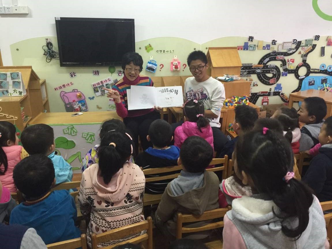 随后同学们来到市光幼稚园,找到了还在上中班的小朋友们,小朋友们早已排排坐好等待。同学们经过一些简单的准备后便开始了活动。先由社会志愿者播放了一首儿歌,带着小朋友们从头到脚进行了热身,待小朋友都坐定了,她拿出早就准备好的儿童读物,绘声绘色地给他们讲了《一园蔬菜成了精》的故事,小朋友们听得都很认真,有的忍俊不禁,还有的在故事结束时提出了自己的一些新颖的想法。这样一个简单的故事,对开发小朋友的想象力就起到了很大的作用,而且也让老师对每个小朋友的思维方式有了更确切的了解。