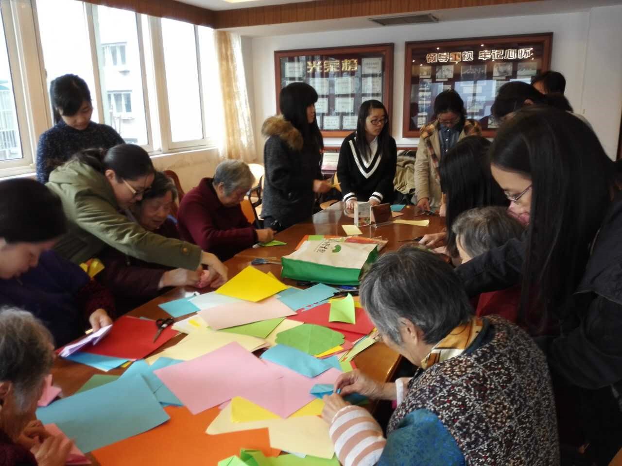 本次活动由班级内部的三个联谊寝室和另外报名的同学组成,共13人,到达福利院后同学们联系了社区福利院的负责人郭欢欢女士,得知下午上海理工大学的同学正好给老人们上手工课,于是我们主动承担帮助手工课老师协助老人完成折纸课程。另外,由于一小部分老人没有参加手工课程,所以我们分为了两个组,一个组和老人折虎头鞋,另一个组陪伴老人折蝶和花朵。