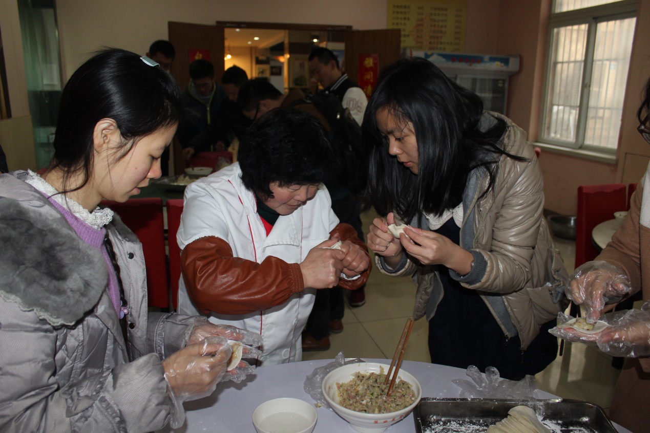 此时,经院的老师、辅导员以及其他一些同学也陆续到来,不少人兴奋地加入了包饺子的行列,颇露了一手,赢得大家的好评。很快,饺子皮和肉馅已尽,餐厅的服务员帮助同学们将饺子下锅,大家围着桌子团团坐,石磊老师做了饭前讲话,幽默的话语将气氛带到了高潮,在一片鼓掌声中,大家纷纷动筷,尽享聚餐的快乐。不一会儿,饺子上桌了,大家迫不及待地品尝自己的劳动成果,“这一定是我包的”“那可是我包的”,人人脸上笑开了花。